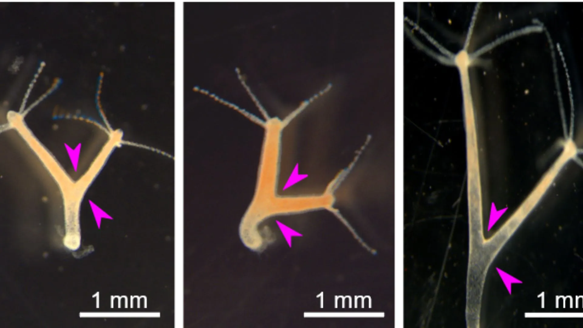 Image: Hydra vulgaris with suppressed TMOD1 expression showing the non-detaching Y-shaped bud still attached to the parent Hydra. Credit: Authors,
