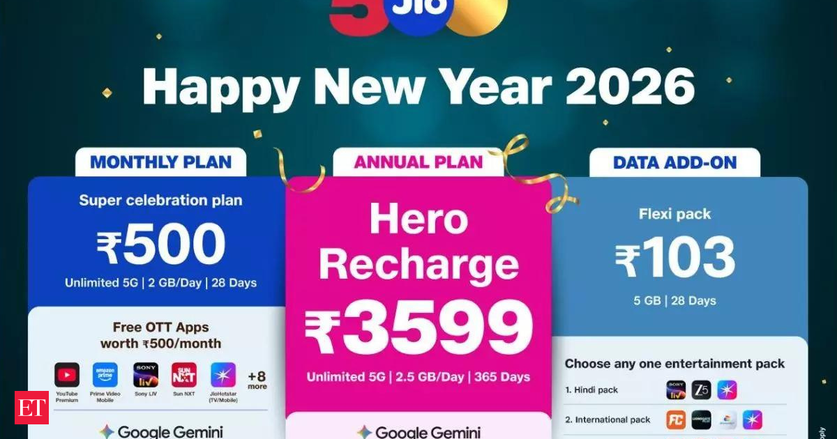 Reliance Jio unveils its Happy New Year 2026 recharge plans. These offers include annual and monthly options with unlimited 5G data. Users also receive popular OTT subscriptions and a limited-period Google Gemini Pro offer. A Flexi Pack prov…